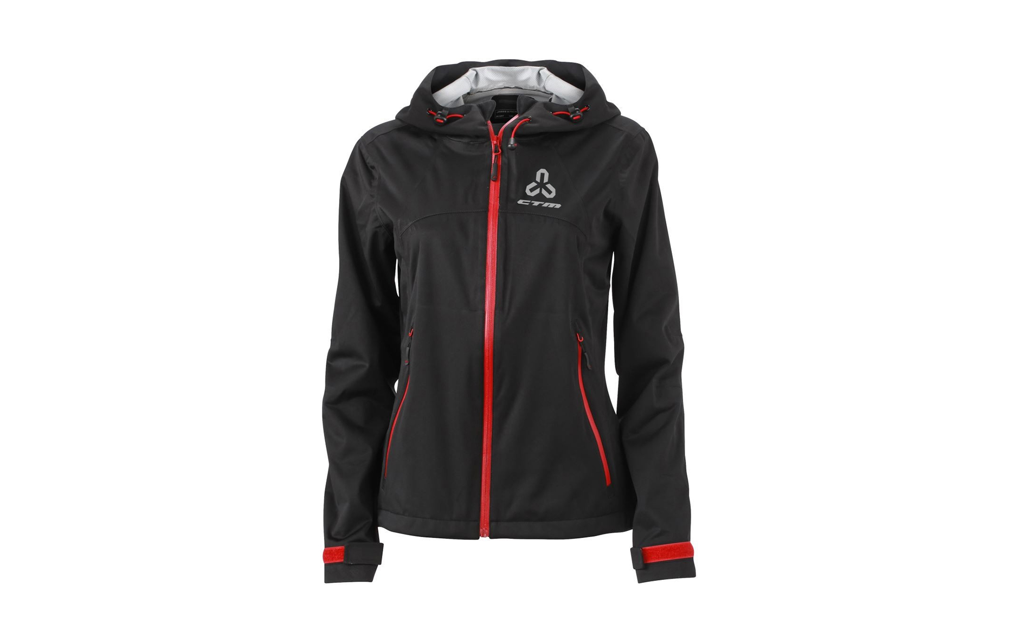 Ultra ľahká dámska softshelová bunda CTM, vyrobená z funkčného materiálu s TPU-membránou; Vodný stĺpec 10 000 mm; Priedušmosť 5 000g/m2 za 24 hod; Všetky švy podlepené, zadná časť bundy je predĺžená; Obojstranný vodeodolný farebný zips; Farba: čierna; Veľkosť: M; Reflexné logá CTM