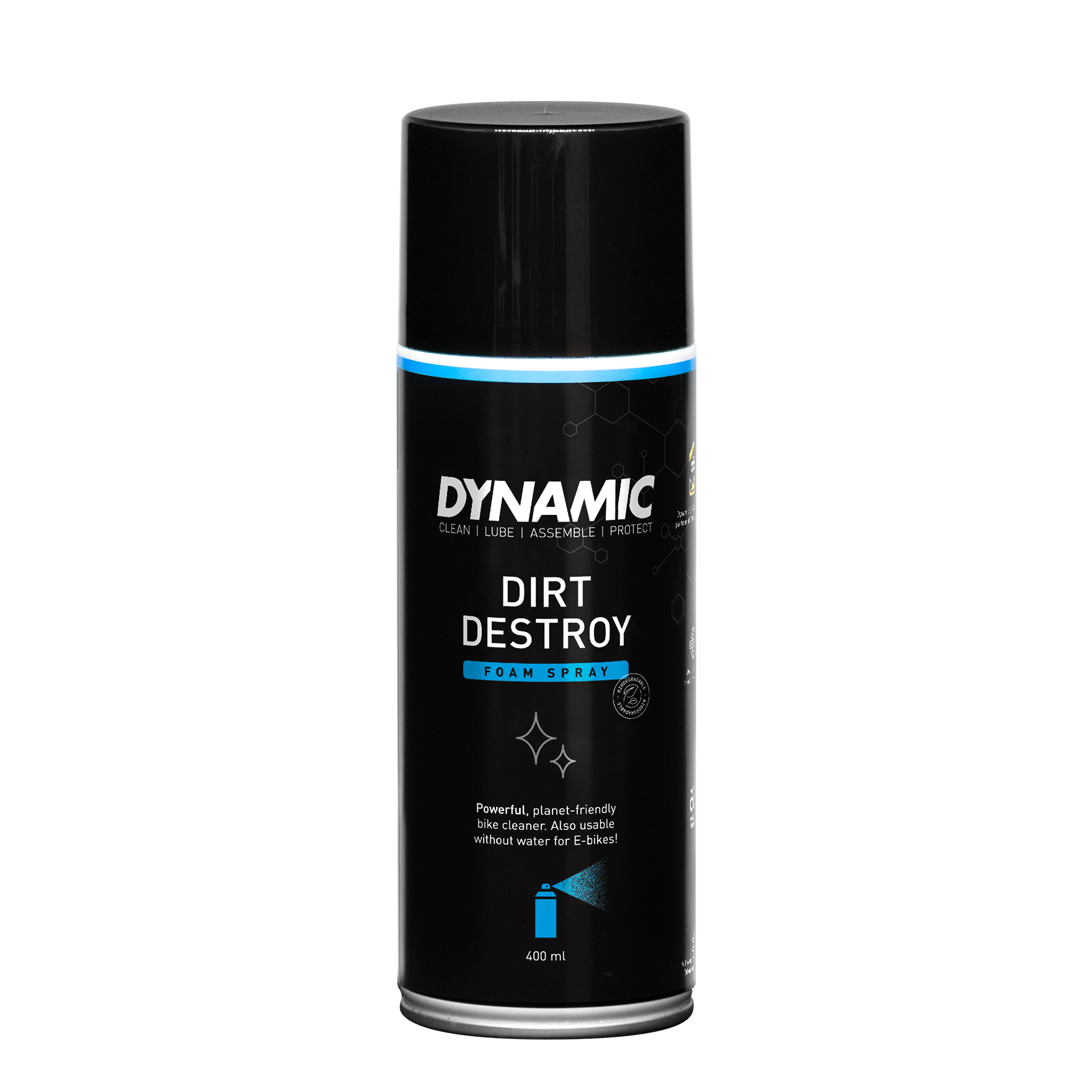 Dirt Destroy Spray od značky Dynamic je výkonný penový čistič navrhnutý špeciálne pre bicykle vrátane športových elektrobicyklov – bez vody, bez kompromisov. Tento biologicky odbúrateľný sprej šetrne, no účinne odstráni špinu z rámu, komponentov aj ťažko prístupných miest. Bezpečne ho použiješ na karbón, hliník, gumu, keramiku i ďalšie bežné materiály. Stačí nastriekať, nechať pôsobiť 2–3 minúty a opláchnuť – alebo len zotrieť handričkou, ak si práve na cestách. Skvele si poradí aj s osviežením textílií, ako sú rukavice či prilba.
