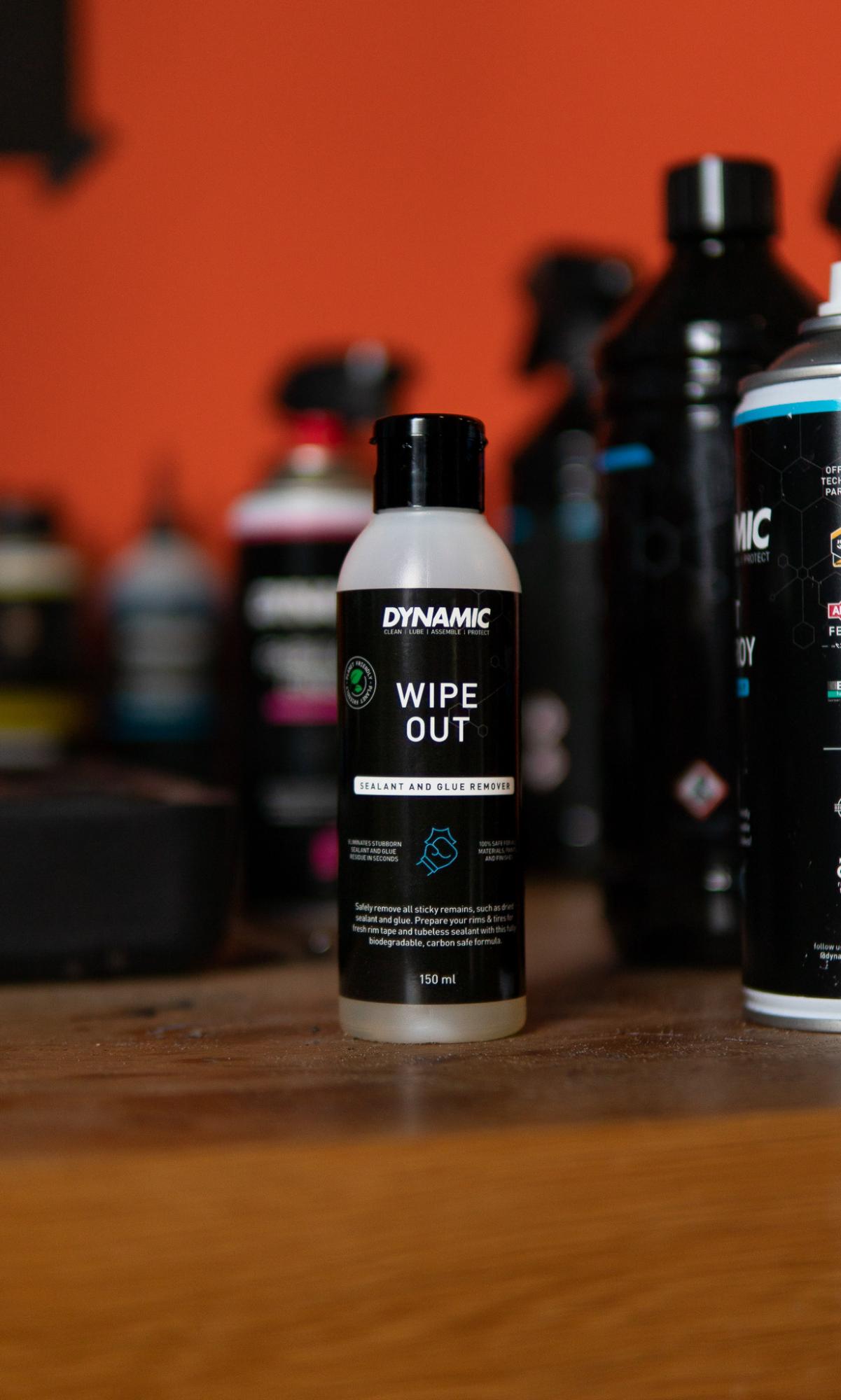 Dynamic Wipe Out je biologicky odbúrateľný odstraňovač zaschnutého bezdušového tmelu, lepidla a mastnoty, ktorý zanechá ráfiky aj plášte dokonale čisté a pripravené na novú montáž. Vďaka silnému, no šetrnému zloženiu ľahko odstráni aj vodeodolné mazivá, olej, vosk alebo inú špinu, bez toho aby poškodil lak či povrchové úpravy. Je vhodný na použitie na hliník, oceľ, titán, karbón, plast, gumu aj tesnenia. Prípravok je oplachovateľný vodou, nezanecháva zvyšky a funguje aj ako extrémny odmastňovač.