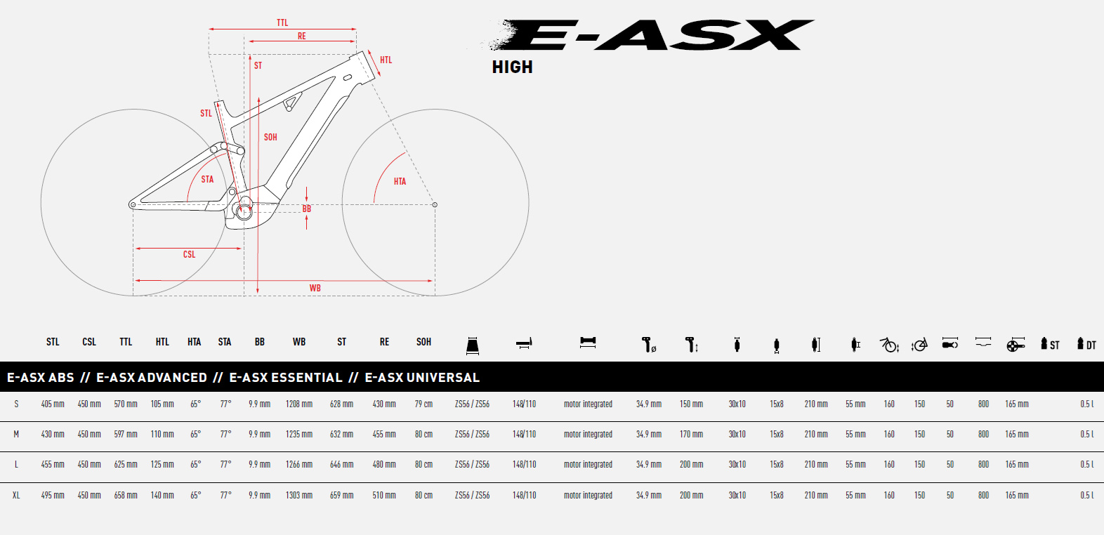 E-ASX spája modernú geometriu s hliníkovým rámom a ponúka perfektnú rovnováhu medzi tuhosťou a hmotnosťou. S nosnosťou až 150 kg je GHOST E-ASX pripravený na všetky multi-športové dobrodružstvá. Progresívna kinematika s až 160 mm zdvihom vpredu a 150 mm vzadu zabezpečuje výbornú trakciu a komfort v náročnom teréne. Okrem klasických modelov s vysokým nástupom sú v ponuke aj unikátne športové modely s nízkym nástupom (Low) a odpružením 140/130 mm – tieto rámy umožňujú pohodlnejší nástup a zároveň zachovávajú pravý výkon e-MTB. Verzie EQ sú vybavené blatníkmi, nosičom, osvetlením a stojanom – ideálne pre dlhé výlety, každodenné dochádzanie alebo náročné cestovanie. Všetky High modely sú dodávané ako mullet tzn.: 29“ koleso vpredu a 27,5“ vzadu. Modely EQ a LOW sú na 27,5“ kolesách.