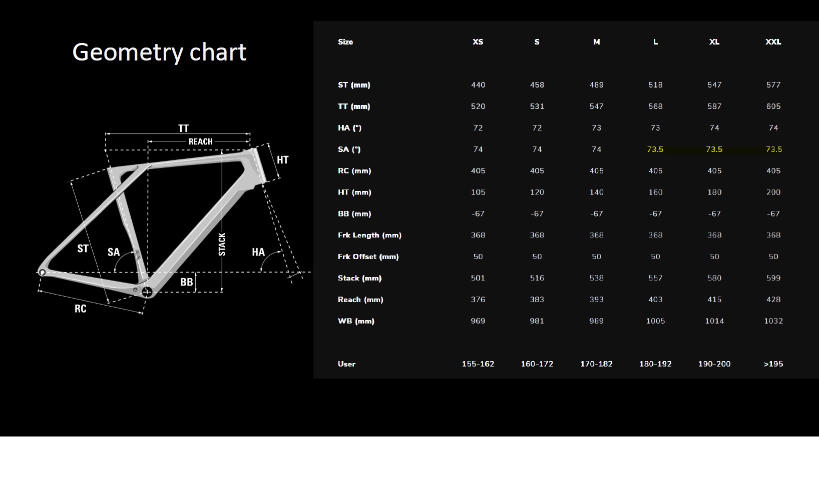 Najvýraznejšími zmenami v geometrii je o 0,5° kolmejšia sedlovka (74°). Kratšia hlavová trubka s nižším odporom vzduchu a dlhší Reach pre viac športový posed zameraný na výkon. Do ponuky tiež pribudla veľkosť XXL pre jazdcov nad 195 cm.