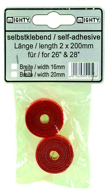 Vysoká trieda, 0,5 mm tenká, červený nylon, špeciálna vrstva chrániaca pásku proti kĺzaniu, odoláva vysokej teplote, ultraľahká, iba 15g v rozmere 16-622, vhodná pre 12''-28'' kolesá, s dierkou pre ventil, 1 pár=2x2 m v PE-vrecku, 16 mm