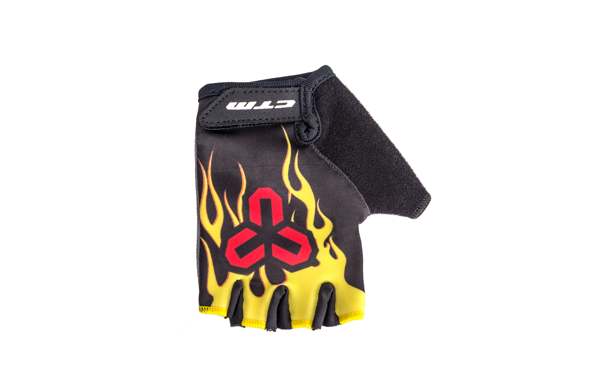 "Detské krátke rukavice so zapínaním na suchý zips; Priedušný a odolný materiál; Na dlani gelové vankúšiky; Farba: motív oheň; Veľkosť: XS"
