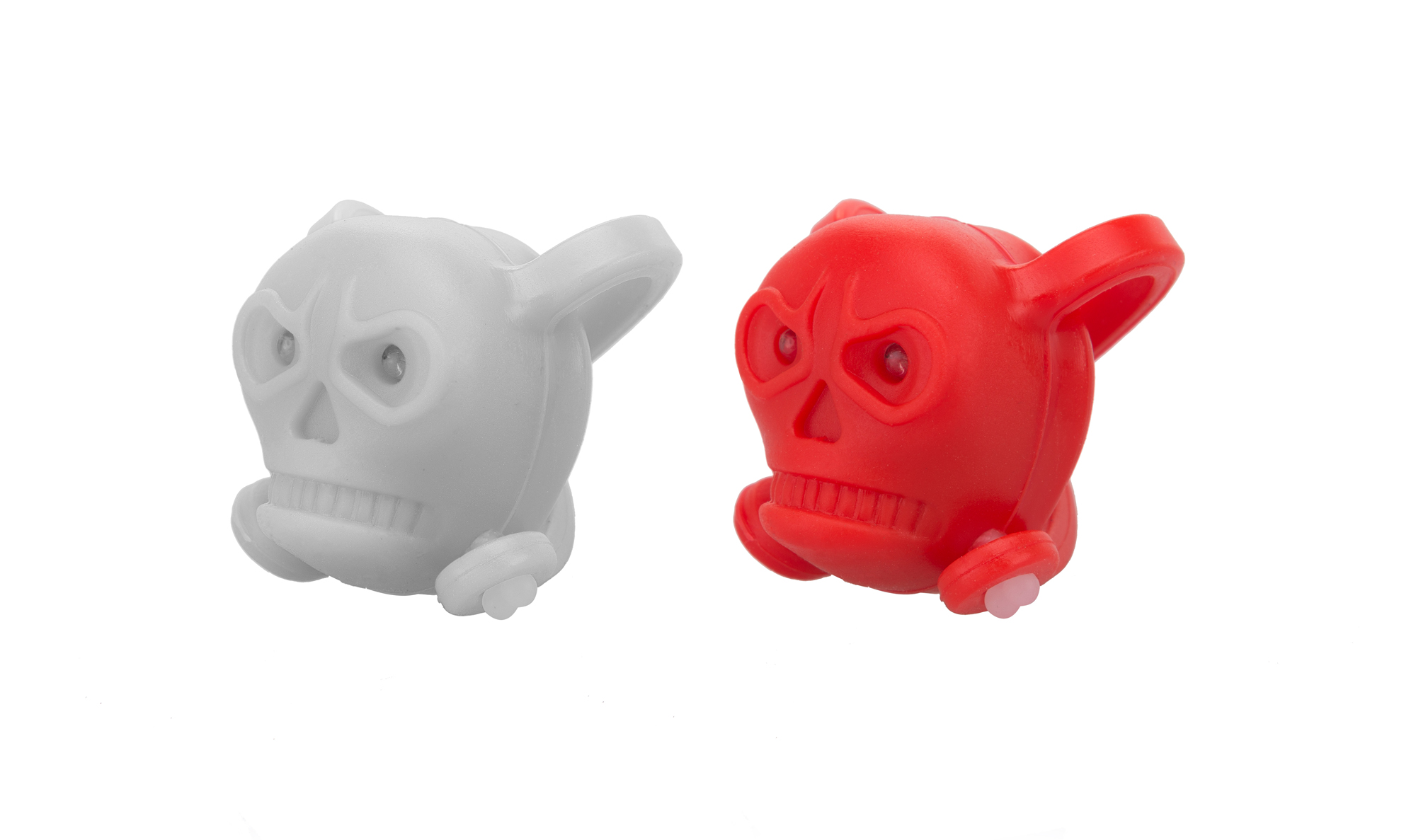 "Sada silikónového mini osvetlenia v tvare lebky; Funkcie: blikanie - stále svetlo; Univerzálne uchytenie pomocou gumových očiek; Obsahuje dve blikačky: biele a červené svetlo; Farba: biela a červená lebka"
