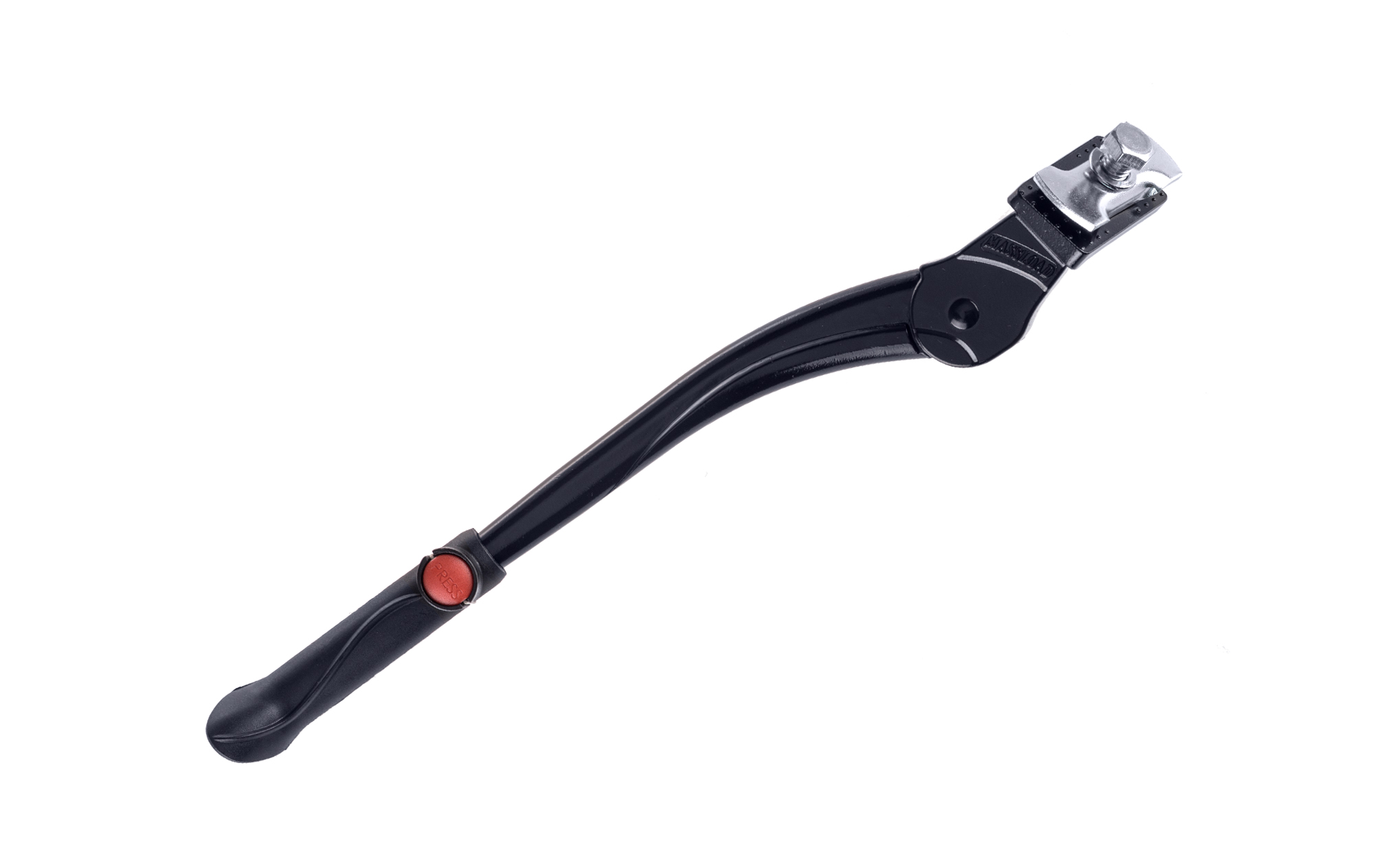 Kvalitný hliníkový stredový stojan pre 24''-28'' bicykle; Plastová pätka; Nastaviteľný s protikusom; Váha: 250g; Farba: čierna"