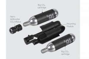 Ulta-kompaktná CO2 mini hustilka NANO AIRBOOSTER v sade s dvomi závitovými 16g CO2 náplňamis uchytením pod sedlo pomocou držiaku DF (DUO FIXER - v balení), s ktorým využijete priestor medzi sedlom a podsedlovou taškou QuickClick, prípadne d