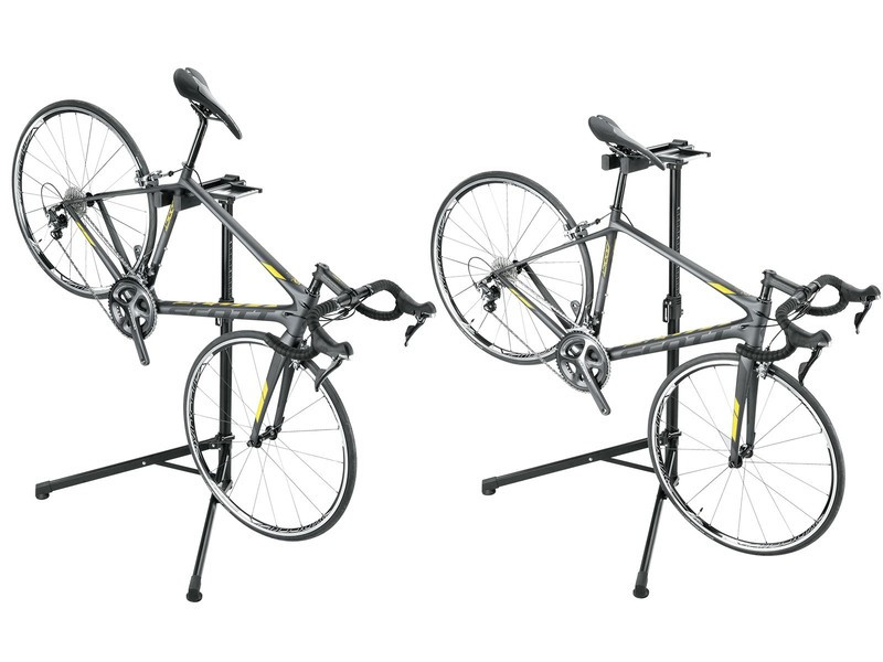 • uchytenie bicykla zavesením o sedlovú rúrku alebo pod sedlo, s predným kolesom na zemi (nekompatibilné s aero sedlovkami širšími nez 45 mm)
