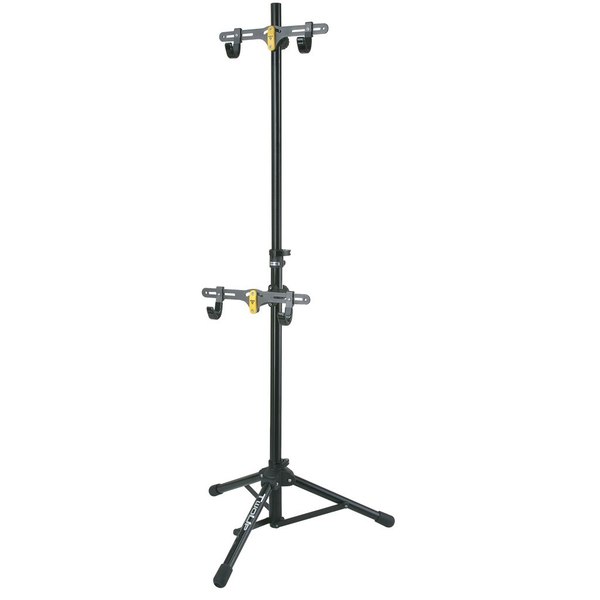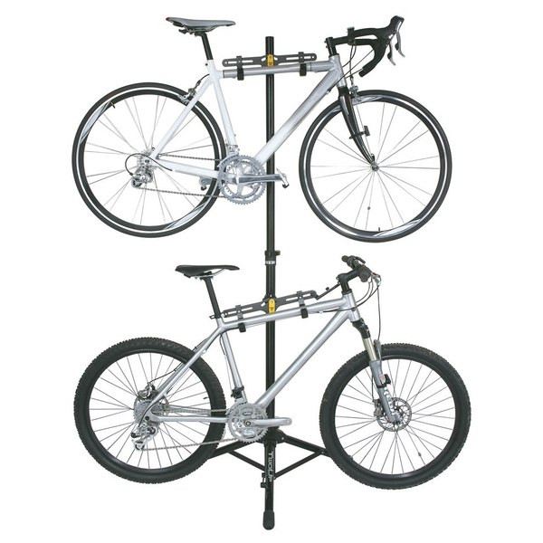 Skladací poschodový uskladňovací systém pre bicykle, ktorý poslúži aj ako prenosný servisný stojan. • voľne stojaca konštrukcia so stabilnou trojnožkou s výsuvnou a nastaviteľnou tyčou • závesné ramená nastaviteľn